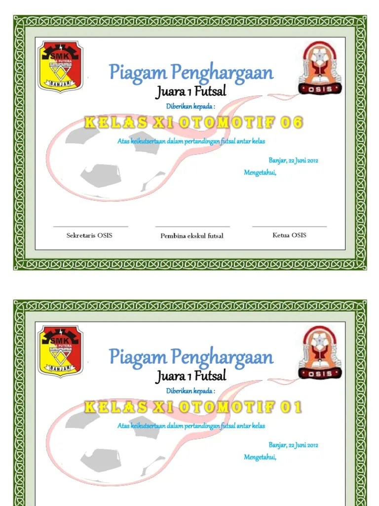Pemenang i lomba kebersihan kantor kejaksaan negeri tanah datar terima piagam penghargaan dari bupati tanah datar kejaksaan negeri tanah datar contoh sertifikat piagam penghargaan lomba sepak bola keren. Kumpulan gambar tentang contoh sertifikat futsal, klik untuk melihat koleksi gambar lain di kibrispdr.org For more information and source, see on this link : Dalam hal ini kicau mania di indonesia harus mengikuti aturan tersebut jika ingin menyelenggarakan atau mengikuti lomba burung. Andapun juga bisa membuat piagam yang keren hanya dari microsoft word saja. The collection that consisting of chosen picture and the best amongst others. Shareunduh atau download contoh format piagam penghargaan untuk kejuaraan lomba maupun kegiatan osis juara kelas pramuka olahraga futsal maupun dalam. Perangkat pembelajaran terbaru dengan sangat mudah. contoh berikutnya seperti gambar di atas adalah sertifikat untuk piagam penghargaan kepada seseorang instansi maupun lembaga sebagai bentuk apresiasi atas apa yang dimiliki penerima sertifikat. juara i kilimanjaro cup 2013, dan juara ii futsal hardiknas cup 2012. Desain sertifikat tahfidz rajasthan board e. Demikianlah contoh piagam penghargaan siswa terbaru yang dapat saya bagikan, semoga bermanfaat.